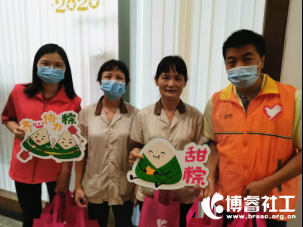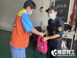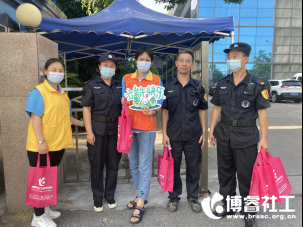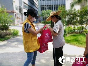 6月23日下午,职工家社工与社区志愿者们将精心准备的爱心端午礼包与桂城职工安康知识宣传小册子送到正在工作的职工手中,感谢他们为社区建设做出的贡献。
