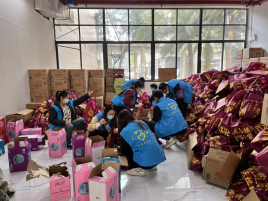 广东广宇科技发展有限公司往年积极通过人力支持、捐赠物资的方式支持送福到家,今年也不例外,12月30日下午8名来自广宇的职工来到福袋分装现场,为爱心车队的150个福袋注入爱心与力量。