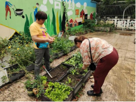 活动开始,社工简单介绍本次活动的内容及种植的相关注意事项,然后长者们拿起锄头、铲子等工具,分工合作,有的长者负责将泥土倒进种植盆里,有的长者负责为土地进行松土、除草和整理等。做好这些种植前的准备工作后,社工为长者们分发种子,指引长者移植菜苗到空地上种植。长者们凭借多年的种植经验,很熟练地撒播种子、移植菜苗,不一会儿,原有的空地上都种满了植物。现场气氛热烈,一阵阵欢声笑语回荡在农场周围。