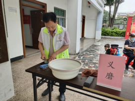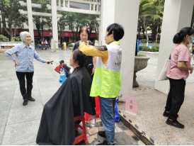 在义磨区,磨刀志愿者拿着各类刀具在磨刀石上反复打磨,磨好后还小心将其包好交到长者手里。另一边的义剪区也非常受长者的欢迎,长者们一边聊天一边等候理发,现场气氛温馨热闹。有长者说道:“不用去医院就有医生免费帮检查身体,还有免费磨刀、剪发,真方便!”